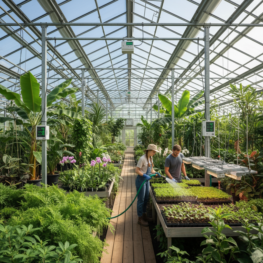 The photo shows two people working inside a bright, modern glass greenhouse filled with various plants, including ferns, orchids, and large banana plants. A woman is carefully watering trays of seedlings with a hose, while a man tends to a nearby bench. The structure features metal supports and environmental monitoring devices. This active scene suggests the dedicated, hands-on care required for commercial plant cultivation in a controlled, indoor environment.
