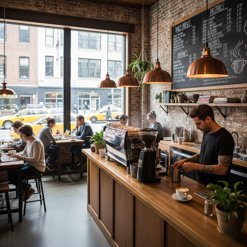 The photo shows a cozy café with large windows looking out onto a busy street. Inside, several people are seated at wooden tables, working on laptops or chatting over coffee. A barista at the counter is preparing a drink, giving the place an active yet relaxed atmosphere. Warm lighting and brick walls add to the café’s comfortable and modern feel. Overall, it captures a calm moment in a lively urban setting.