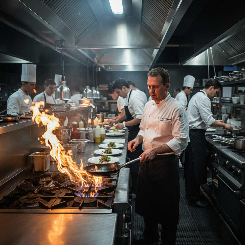 The photo shows a busy professional kitchen where several chefs are preparing dishes. One chef in the foreground is cooking over a high flame, creating a dramatic burst of fire from the pan. In the background, other chefs are focused on plating food and handling different tasks. The stainless-steel equipment and organized workspace highlight the fast-paced environment. Overall, the scene captures the intensity and teamwork required in a high-end restaurant kitchen.